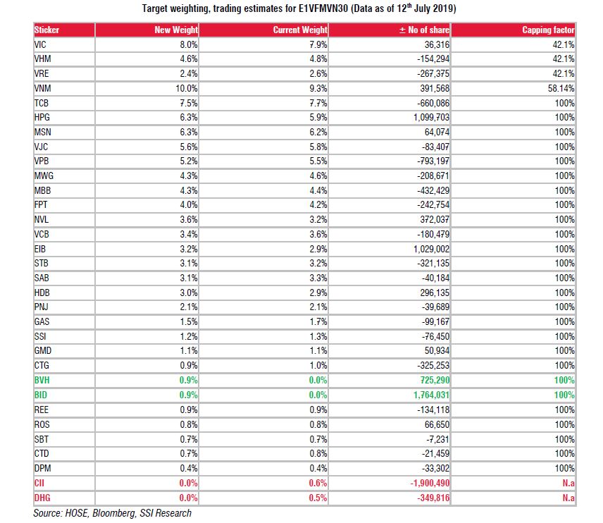 월요일 호치민 증권거래소(HOSE)에서는 VN30 변동 리뷰 자료를 발표했다. 주요 내용은 VN30 지수에 신규 편입 종목인 바오비엣 홀딩스(BVH), 베트남 투자개발은행(BID)으로 각각 비중 0.9%로 신규 편입되었다. 호치민시 기술인프라 투자 주식회사(CII) DHG 제약(DHG)은 VN30에서 제외되었다. 종목을 변경하는 핵심 변수로는 유동비율과 비중 한도 비율을 고려하여 조정되어 있다. 내용을 살펴보면 빈그룹 계열(VIN, VHM, VRE)은 빈그룹을 제외하고 비중이 줄고 있는 추세다. 반면에 비나밀크는 크게 늘어났다.